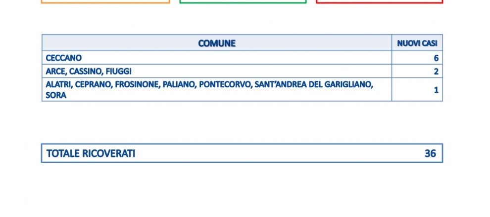 Pochi positivi ma anche pochi tamponi: sono 19 i nuovi contagiati in provincia di Frosinone, emersi però da soli 435 tamponi processati. C’è anche una vittima, un 66enne di Sora. È Ceccano la città che fa registrare il numero maggiore di casi, 6, seguita da Arce, Cassino e Fiuggi con 2. 1 positivo anche ad Alatri, Ceprano, Frosinone, Paliano, Pontecorvo, Sant’Andrea e Sora.