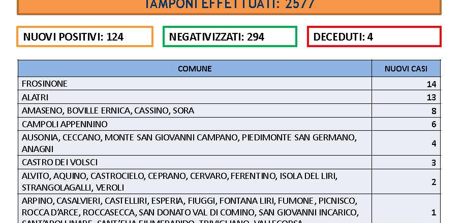 Si registrano però anche 4 decessi: si tratta di un 82enne residente a Frosinone, una donna di 71 anni residente anch’ella nel capoluogo, una 87enne di Pico ed una 68enne residente ad Alatri.