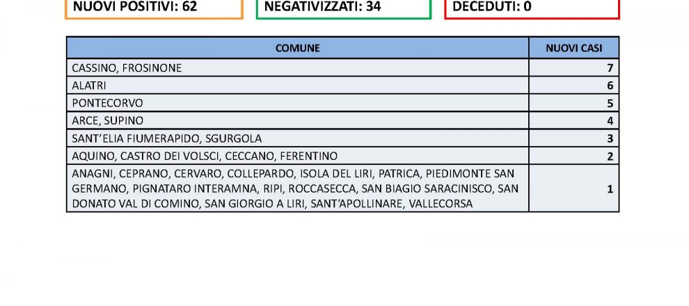 Netta risalita del numero dei positivi e del tasso di positività in Provincia di Frosinone. I nuovi casi sono infatti 62, su un totale di 674 tamponi effettuati. Il tasso di positività è pari al 9,58%. Non si registrano decessi mentre ci sono 34 negativizzati. A guidare la classifica Frosinone e Cassino con 7 positivi a testa; Alatri 6, Pontecorvo 5, Arce e Supino 4, Sant’Elia Fiumerapido e Sgurgola 3, con due Aquino, Castro dei Volsci, Ceccano e Ferentino. Con un caso a testa poi altri 15 comuni.