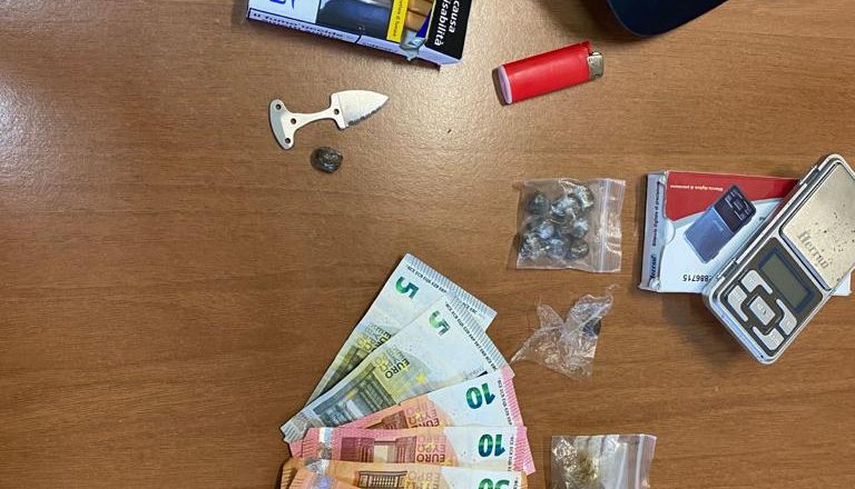 E’ stato trovato in possesso di 0.82 grammi di hashish e di un piccolo coltello a spinta tra le dita della mano.