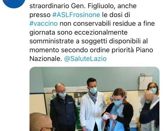 La Asl di Frosinone da concretezza alle disposizioni date di recente dal generale Figliuolo e così in una nota social fa sapere che a fine giornata quelle dosi di vaccino Astrazeneca prenotate ma non inoculate per la mancata presenza del paziente, vengono somministrate a soggetti disponibili al momento secondo l’ordine di priorità stabilito dal Piano nazionale.