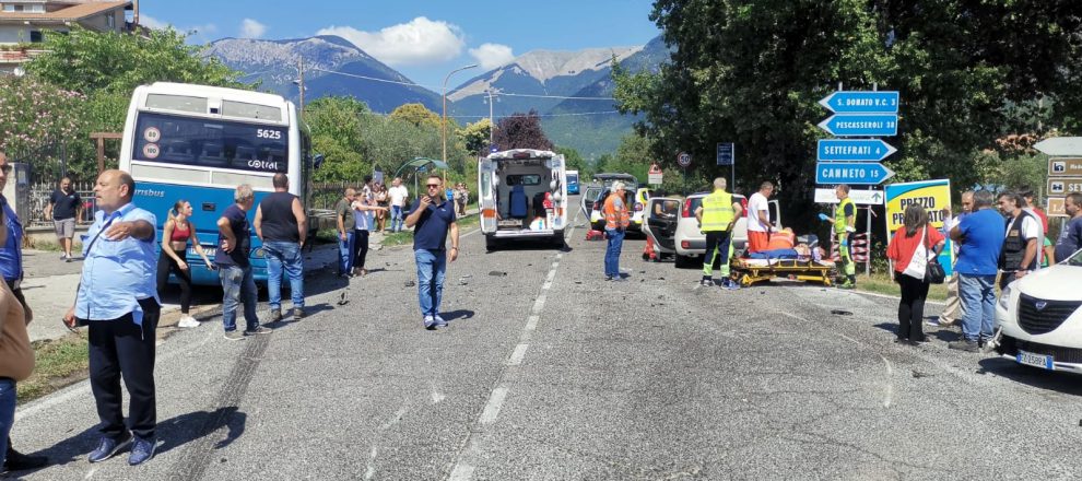 Incidente stradale nel primo pomeriggio sulla strada regionale 509 nel tratto compreso tra Gallinaro e San Donato Val di Comino all’altezza del bivio per Settefrati. Per cause al vaglio delle forze dell’ordine un bus del Cotral è entrato in collisione con una Fiat Panda con a bordo una coppia di anziani residenti in Abruzzo. Secondo una prima dinamica la Panda stava uscendo dall’incrocio ed è stata centrata dall’autobus che non ha potuto evitare l’impatto, andando poi a finire contro la recinzione di un ristorante. Ad avere la peggio i due anziani nella Panda: l’uomo alla guida è stato trasferito a Sora, più serie le condizioni della donna, trasportata in eliambulanza a Roma. Sul posto per i rilievi i Carabinieri ed i Vigili del Fuoco per estrarre i feriti e mettere l’area in sicurezza. L’autista dell’autobus ha riportato solo qualche escoriazione.