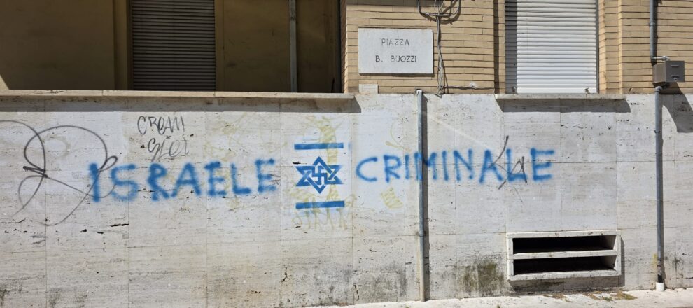 Scritte antisemite sono apparse nella mattinata di domenica in Piazza Buozzi a Latina, nei pressi del Tribunale. La denuncia è arrivata dall‘Unione associazioni Italia-Israele che, oltre alle scritte sui muri, fa luce anche sui ripetuti attacchi social inferti alla comunità ebraica in tutta la provincia.