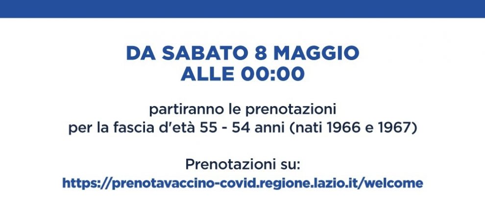 La campagna vaccinale nel Lazio ha ricevuto l’accelerazione sperata ed annunciata nelle scorse settimane dall’assessore regionale alla salute Alessio D’Amato: nella giornata di mercoledì’ sono saliti a oltre 48 mila dosi giornaliere dei vaccini. Prosegue così la maratona vaccinale che si allarga coinvolgendo una nuova fascia d’età: da sabato 8 maggio a mezzanotte, infatti, partiranno le prenotazioni per chi ha 55 e 54 anni (i nati nel 1966 e 1967), sempre attraverso il sito della Regione Lazio.