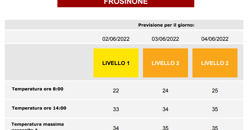 Se le piogge sono pressoché assenti, il caldo si fa sentire. Quelle di venerdì e sabato in Ciociaria sono giornate caratterizzate dal bollino arancione, ovvero il livello 2 di attenzione: quando, cioè, ci sono temperature elevate e condizioni meteorologiche che possono avere effetti negativi sulla salute della popolazione.
