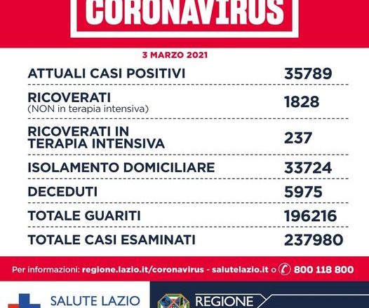 “Oggi su oltre 14 mila tamponi nel Lazio (3.153) e quasi 23 mila antigenici per un totale di oltre 37 mila test, si registrano 1.520 casi positivi (+332), 35 i decessi (+6) e +1.491 i guariti. Diminuiscono i ricoveri, mentre aumentano i casi, i decessi e le terapie intensive. Il rapporto tra positivi e tamponi è a 10%, ma se consideriamo anche gli antigenici la percentuale è al 4%. I casi a Roma città sono a quota 600. La curva dei casi è in ascesa, mantenere rigore nei comportamenti. Nella Asl Roma 1 sono 324 i casi nelle ultime 24h e si tratta di casi isolati a domicilio o con link familiare o contatto di un caso già noto. Sono diciassette i ricoveri. Si registrano nove decessi con patologie. Nella Asl Roma 2 sono 221 i casi nelle ultime 24h e si tratta di casi isolati a domicilio o con link familiare o contatto di un caso già noto. Sono sessantotto i casi su segnalazione del medico di medicina generale. Si registrano undici decessi con patologie. Nella Asl Roma 3 sono 98 i casi nelle ultime 24h e si tratta di casi isolati a domicilio o con link familiare o contatto di un caso già noto. Si registrano due decessi con patologie. Nella Asl Roma 4 sono 101 i casi nelle ultime 24h e si tratta di casi isolati a domicilio o con link familiare o contatto di un caso già noto. Si registrano due decessi con patologie. Nella Asl Roma 5 sono 95 i casi nelle ultime 24h e si tratta di casi isolati a domicilio o con link familiare o contatto di un caso già noto. Si registrano tre decessi con patologie. Nella Asl Roma 6 sono 164 i casi nelle ultime 24h e si tratta di casi isolati a domicilio o con link familiare o contatto di un caso già noto. Si registrano due decessi con patologie. Nelle province si registrano 517 casi e sono sei i decessi nelle ultime 24h. Nella Asl di Latina sono 150 i nuovi casi e si tratta di casi isolati a domicilio o con link familiare o contatto di un caso già noto. Nella Asl di Frosinone si registrano 249 nuovi casi e si tratta di casi isolati a domicilio, contatti di un caso già noto o con link familiare. Si registrano quattro decessi di 63, 64, 87 e 88 anni con patologie. Nella Asl di Viterbo si registrano 79 nuovi casi e si tratta di casi isolati a domicilio o con link familiare o contatto di un caso già noto. Nella Asl di Rieti si registrano 39 nuovi casi e si tratta di casi isolati a domicilio o con link familiare o contatto di un caso già noto. Si registrano due decessi di 60 e 75 anni con patologie” commenta l’Assessore alla Sanità della Regione Lazio, Alessio D’Amato.