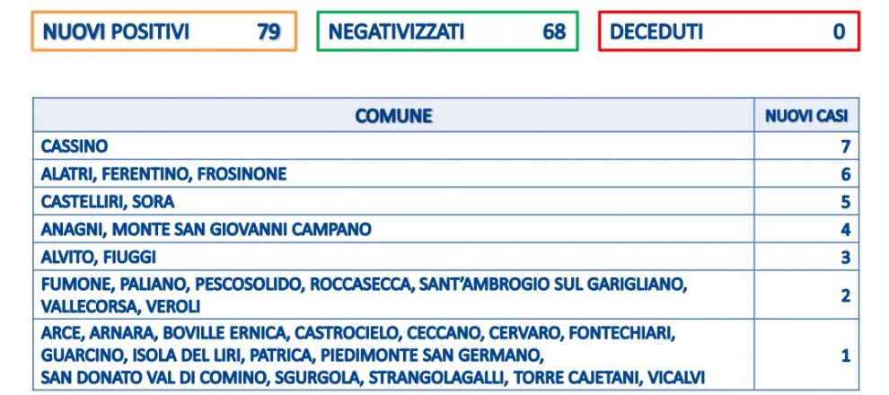 In ciociaria è oltre il doppio domenica con il 6,5%. 1198 i tamponi processati che hanno registrato 79 nuovi positivi con un ricovero in più.  Andando a vedere la mappa del contagio: sono 7 i casi a Cassino.  Poi Alatri, Ferentino e Frosinone con 6. 5 a Sora e Castelliri. 4 a Monte S.Giovanni campano ed Anagni. Tre ad Alvito e Fiuggi e poi altri 23 comuni coinvolti dal contagio con una o due positività.