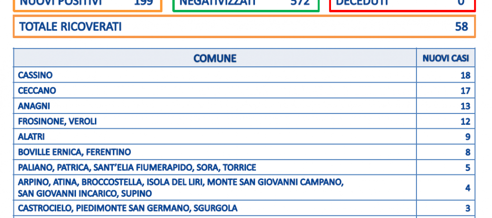 In ciociaria sono 199 i nuovi positivi con il picco a Cassino con i suoi 18 casi. 17 a Ceccano. 13 ad Anagni. 12 rispettivamente a Frosinone e a Veroli. 9 ad Alatri. E poi altri comuni ciociari coinvolti dal contagio con numeri inferiori come vediamo in grafica.