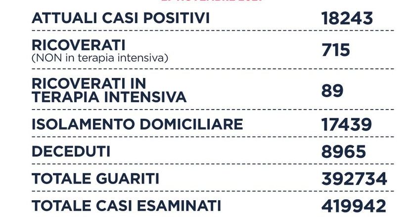 - Raffronto con il 27 Novembre 2020: -63 decessi, -1.072 casi positivi, -2.692 ricoverati in area medica, -266 ricoverati in terapia intensiva, -66.733 in isolamento domiciliare.