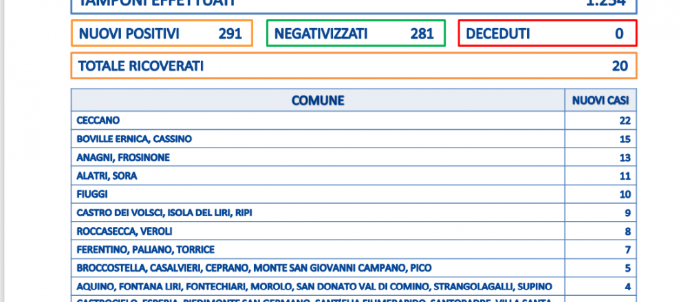 Nel dettaglio in provincia di Frosinone sono 291 i nuovi casi emersi da 1254 tamponi. I guariti sono 281, mentre diminuisce di 6 unità il numero dei ricoverati.