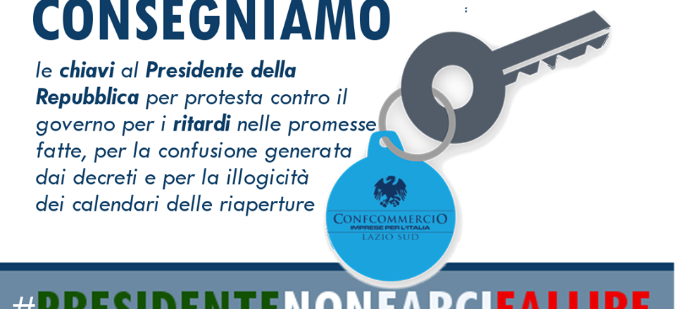 Presidente non farci fallire. E’ l’appello che Confcommercio Lazio Sud rivolge a Sergio Mattarella a cui l’associazione, contestualmente, consegnerà simbolicamente le chiavi dell’associazione in segno di protesta.