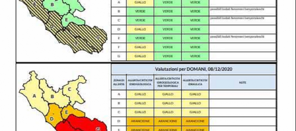 Il bollettino prevede, tra l’altro, per il giorno 8 dicembre, un rischio di criticità “rosso” per il solo rischio idraulico nei bacini che interessano le province di Frosinone e Latina.