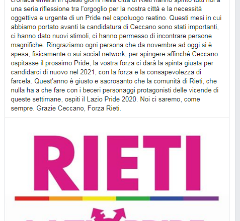 «Quest’anno – ribadisce Indiegesta – è giusto e sacrosanto che la comunità di Rieti, che nulla ha a che fare con i beceri personaggi protagonisti delle vicende di queste settimane, ospiti il Lazio Pride 2020».