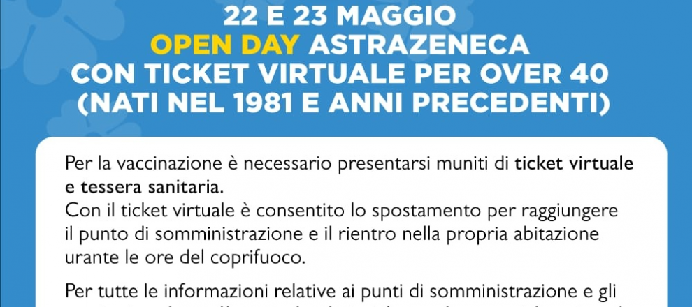 Sabato 22 e domenica 23 maggio ci sarà un nuovo Open Day Astrazeneca con ticket virtuale per gli over 40 (nati nel 1981 e anni precedenti)