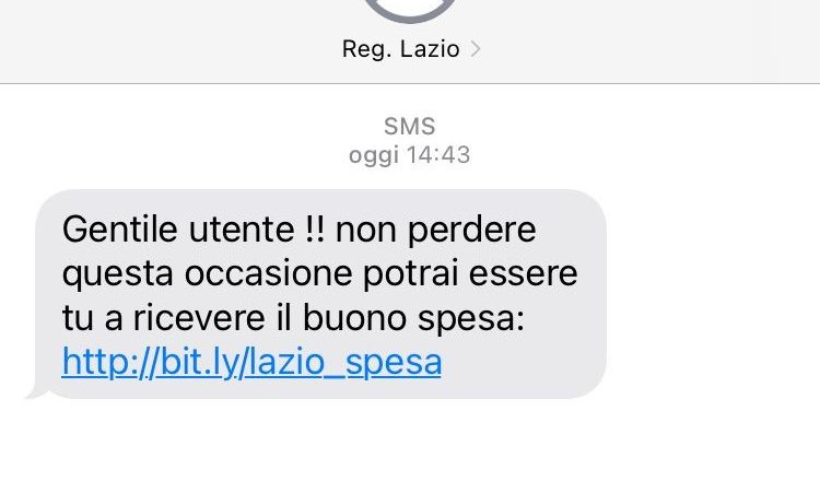 LAZIO – 14 GEN – Sta circolando in queste ore una truffa via sms in cui si invitano le persone a cliccare su un link per ricevere un buono spesa. La Regione Lazio è totalmente estranea all’iniziativa e si invitano tutti gli utenti a non cliccare sul link. Ogni comunicazione riguardante i buoni spesa viene comunicata solo ed esclusivamente attraverso comunicazioni e canali ufficiali della Regione Lazio.