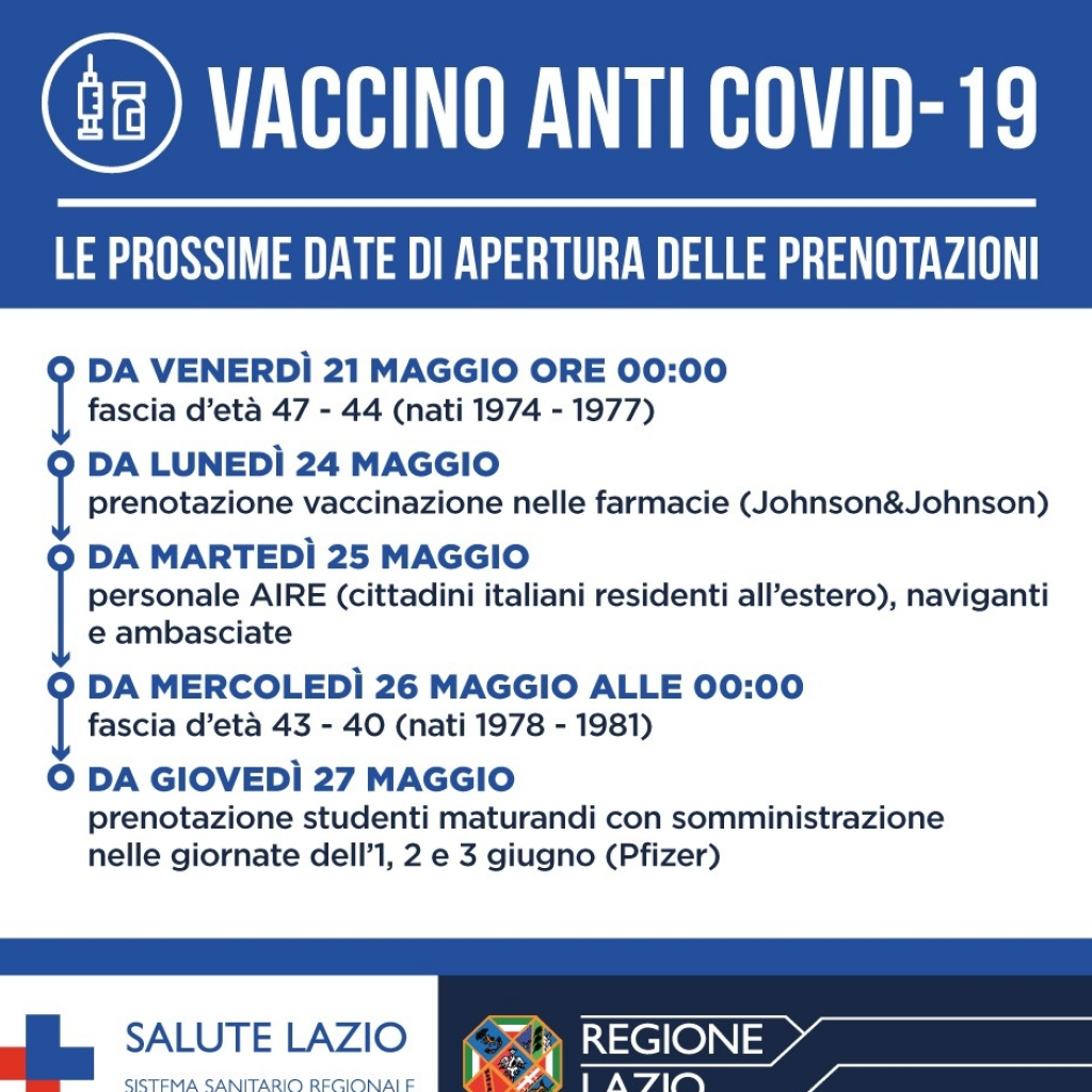 La marcia delle vaccinazioni nel Lazio procede spedita. Se da venerdì alle 24:00 saranno aperte le prenotazioni per le vaccinazioni dedicate alle classi di età 47/44 anni (nati 1974/1977), lunedì 24 maggio partiranno le prenotazioni, sul portale regionale salutelazio, del vaccino J&J nelle farmacie.