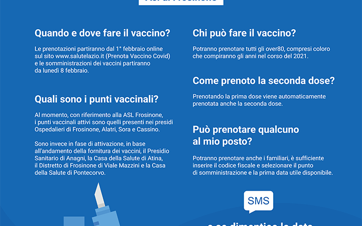 I punti di somministrazione in tutta la Regione sono 50, tutti attrezzati per garantire la catena del freddo e la sicurezza nella somministrazione. In Ciociaria sono due i punti di somministrazione individuati a Frosinone e Cassino oltre alla squadra domiciliare, mentre in provincia di Latina cinque: Santa Maria Goretti, Casa della Salute Aprilia e Priverno, ospedali di Fondi e Formia .