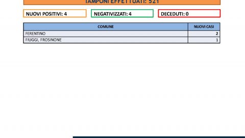 FROSINONE – 10 LUG – Nelle ultime 24h, sono stati effettuati 521 tamponi nel territorio della ASL di Frosinone.Sono stati