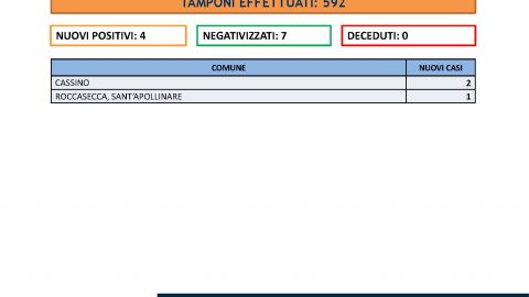 FROSINONE – 04 LUG – Nelle ultime 24h sono stati effettuati 592 tamponi.Sono stati registrati 4 nuovi casi di positivi