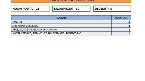 In provincia di Frosinone sono 15 i nuovi casi positivi su 720 tamponi effettuati, il rapporto è 2.08%. I negativizzati