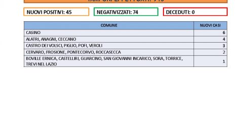 Nessun decesso nel bollettino della domenica della Asl di Frosinone, quello che si riferisce alle 24 ore precedenti. In Ciociaria