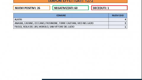 In Provincia di Frosinone sono stati effettuati 1272 tamponi. Registrati 26 nuovi casi di positivi al Sars-CoV-2. Sono 60 i