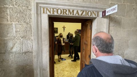 Un gruppo di turisti guarda ammirato i giardini, che splendono nonostante le nuvole: il sole non ha accompagnato la riapertura