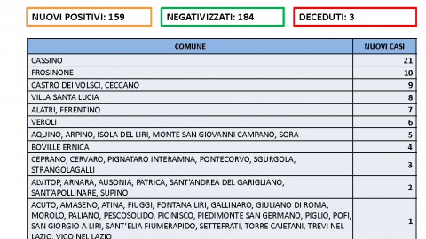Tornano a salire i contagi in provincia di Frosinone: sono 159 i nuovi positivi, emersi da un totale di 2410