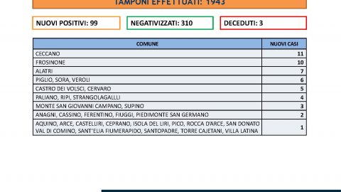 FROSINONE – 07 APR – Nella data del 6 aprile sono stati effettuati 1943 tamponi. Sono stati registrati 99 nuovi
