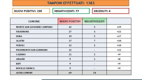 Frosinone – Covid, 239 positivi. Record a Monte S. Giovanni, 42 nuovi casi