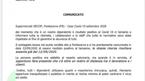 Un caso di positività al Covid 19 che riguarda una persona che lavora nel supermercato Gecop di Pontecorvo. A darne