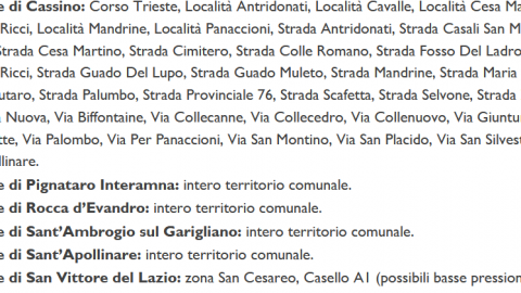 Martedì 21 febbraio 6 comuni al confine tra Lazio e Campanaia resteranno senz’acqua. I disservizi si registreranno a Cassino, Pignataro