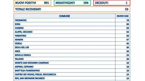 Tornano sotto quota mille i casi in provincia di Frosinone: sono 991. C’è anche una vittima: una donna di 67