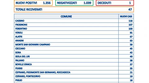 Picco di contagi in provincia di Frosinone dove è stato superata quota mille: sono 1.356 casi, emersi su 4.814 tamponi