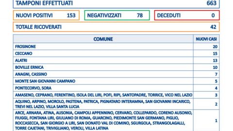 Zero decessi e 153 nuovi casi in provincia di Frosinone emersi su 663 tamponi. Il tasso di positività è al