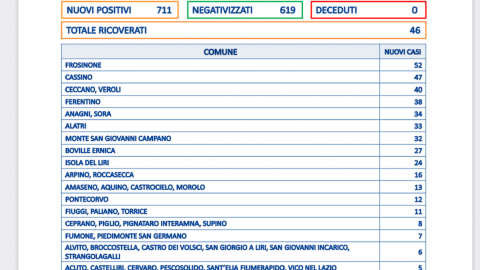 Zero decessi e 153 nuovi casi in provincia di Frosinone emersi su 663 tamponi. Il tasso di positività è al