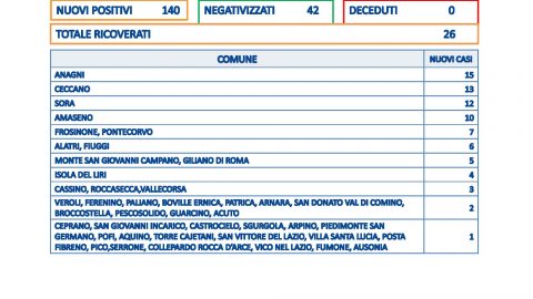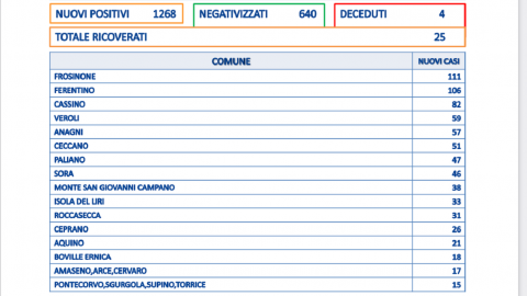 Effetto lunedì: Zero decessi in provincia di Frosinone dove ci sono 140 nuovi positivi su 517 tamponi. Il tasso di