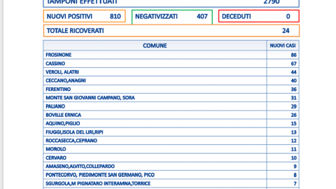810 i positivi in Ciociaria. 2790 i tamponi effettuati. Il tasso è al 29%. Non ci sono decessi. Sono tantissimi