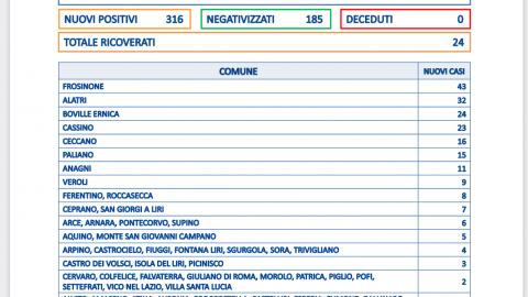 Sono 316 i contagi da Covid in Provincia di Frosinone. Sono stati 1347 i tamponi processati. Alto il tasso di
