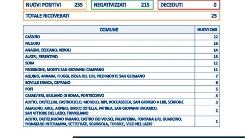 FROSINONE – Salgono i casi in provincia di Frosinone oggi a quota 255 su 1.427 tamponi processati. Non risultano decessi,