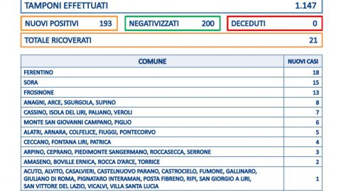 Ancora zero decessi e 193 nuovi casi in provincia di Frosinone emersi su 1.147 tamponi. Il tasso di positività 16,8%.