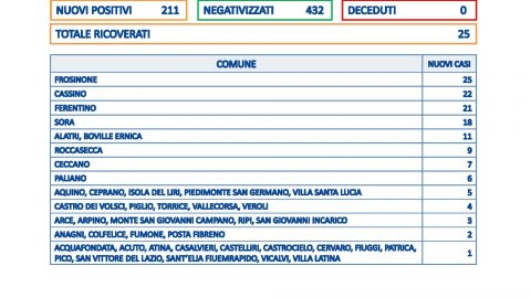 FROSINONE – Sono 211 i nuovi casi in provincia di Frosinone su 1.475 tamponi processati. Non risultano decessi, sono 25