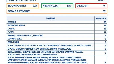 In provincia di Frosinone zero decessi e 227 nuovi casi su 1.577 tamponi, il tasso di positività è al 14,3%.