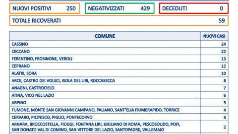 In provincia di Frosinone zero decessi e 250 nuovi casi emersi su 1.424 tamponi, il rapporto è al 17,5%. Sono