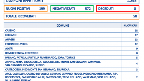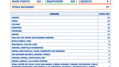 Sono 322 i nuovi casi positivi in provincia di Frosinone. Li ha comunicati la Asl nell’ultimo bollettino: si tratta di
