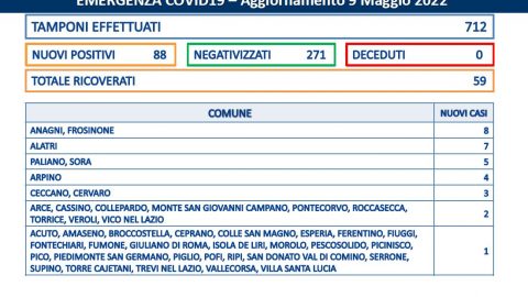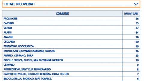 Zero decessi e pochi casi in provincia di Frosinone: sono 88 emersi su 712 tamponi. Il tasso di positività scende