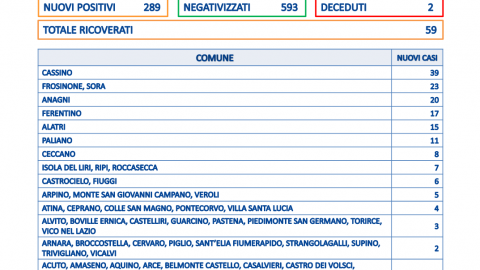 289 i nuovi positivi nel bollettino diramato dalla asl di Frosinone in questa domenica: sono emersi da un totale di