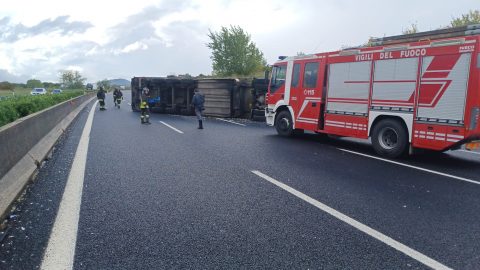 Frosinone – Incidente in autostrada, camion si ribalta, verdura sull’asfalto