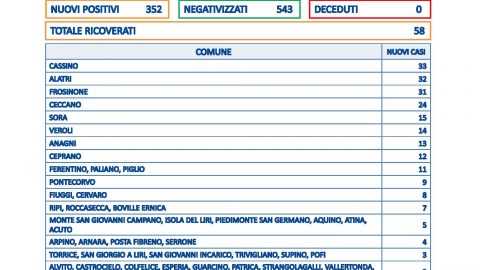 Frosinone – Sono 352 i nuovi casi covid in provincia di Frosinone su 1.879 tamponi processati. Non risultano i decessi,
