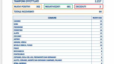 In Ciociaria si registrano 302 contagi su 2217 tamponi. Il tasso è al 13,6 per cento. Ci sono due vittime.